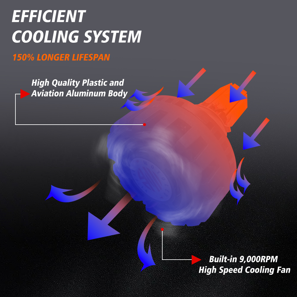 내구성 | 9,000RPM의 고속 무성 팬과 껍질의 핀 디자인은 효과적인 냉각 시스템을 형성, IP67 방수, 50 이상,000 빛나는 연속적인 빛의 시간. |